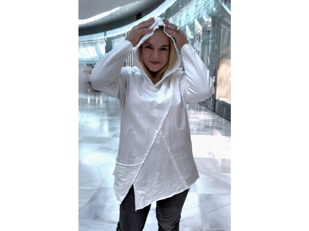 Ležérní tunika s kapucí a asymetrickým střihem, pohodlný, lehce elastický materiál, mačkaný efekt. Stylový kousek z Itálie.