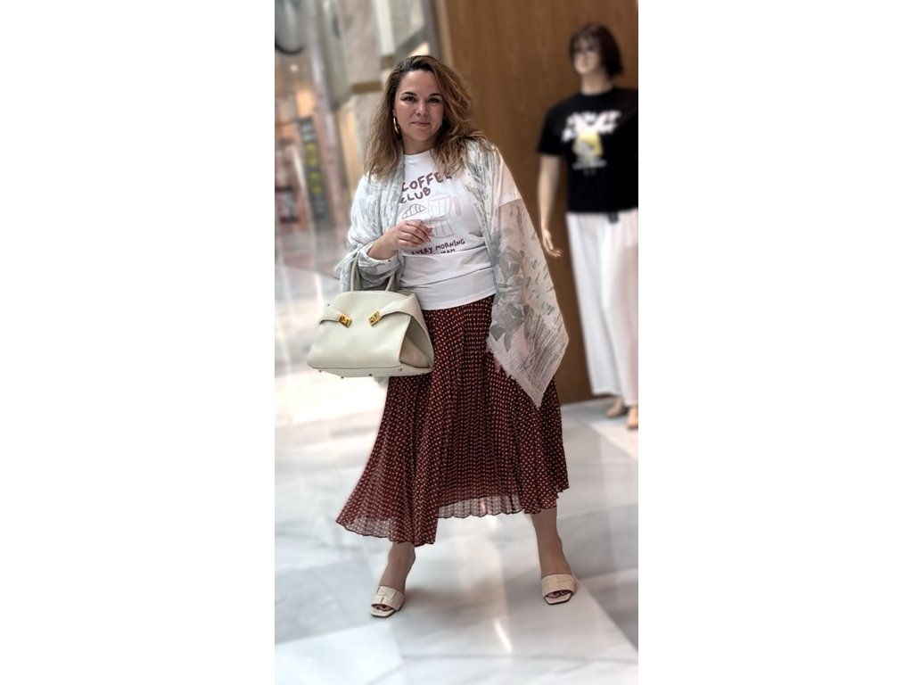 Elegantní plisovaná sukně v midi délce s jemným puntíkovým vzorem. Lehký, splývavý materiál, podšívka. Vyrobeno v Turecku.