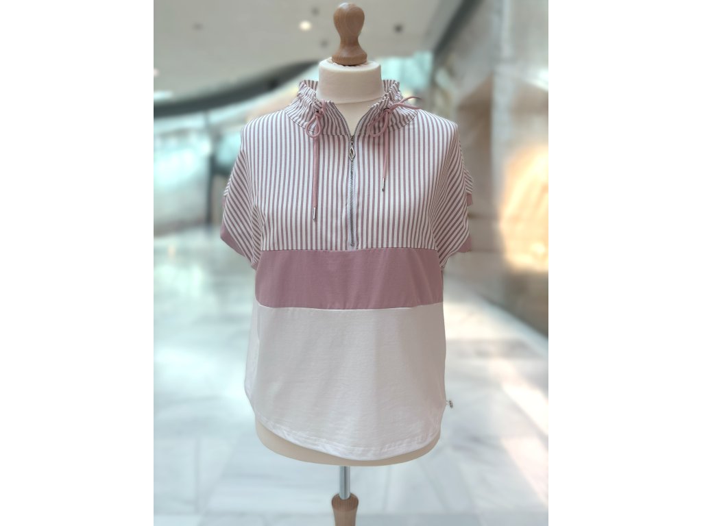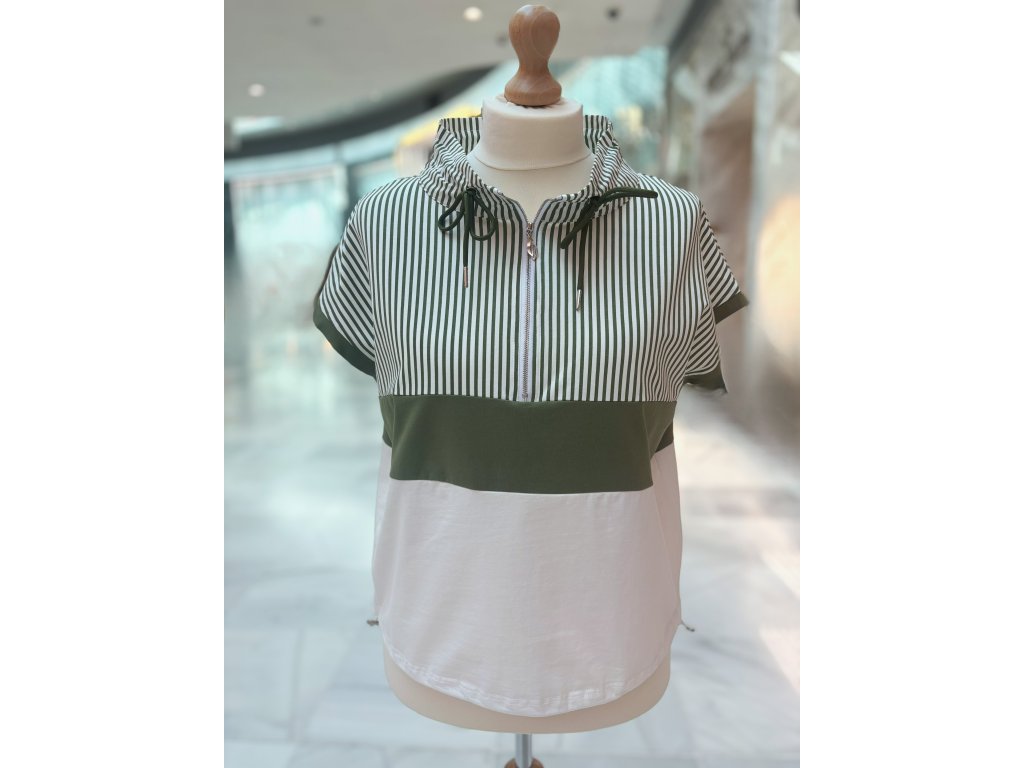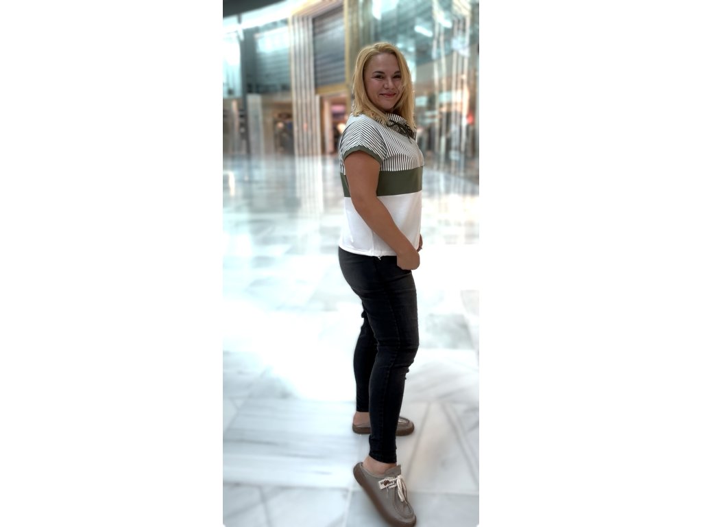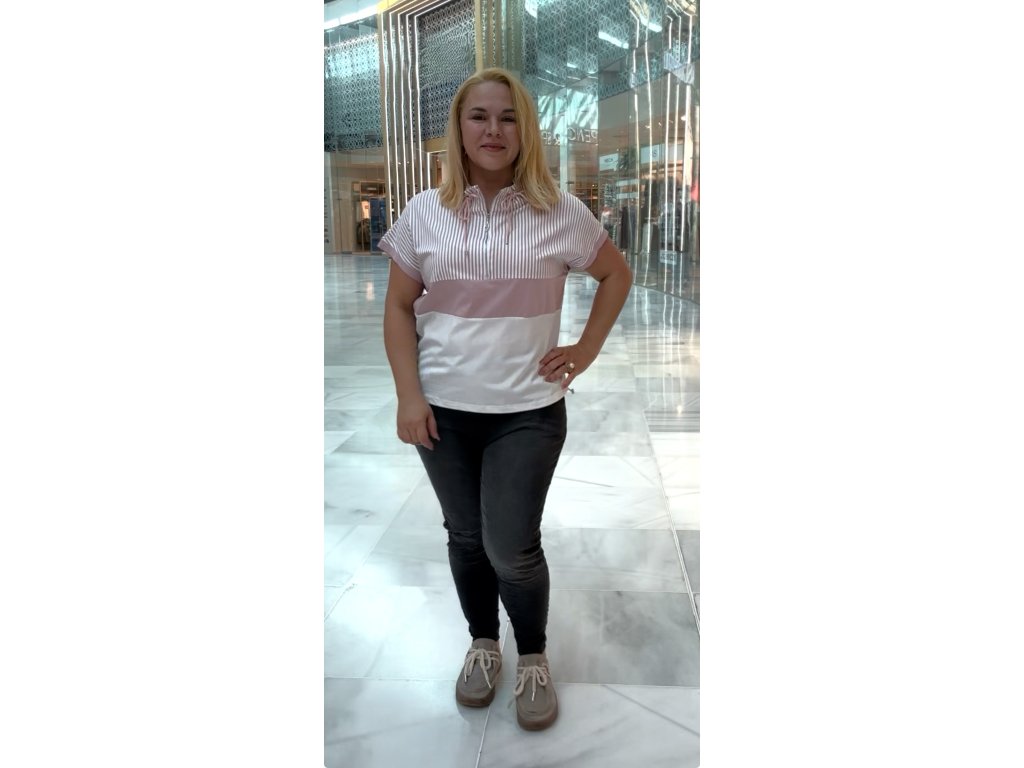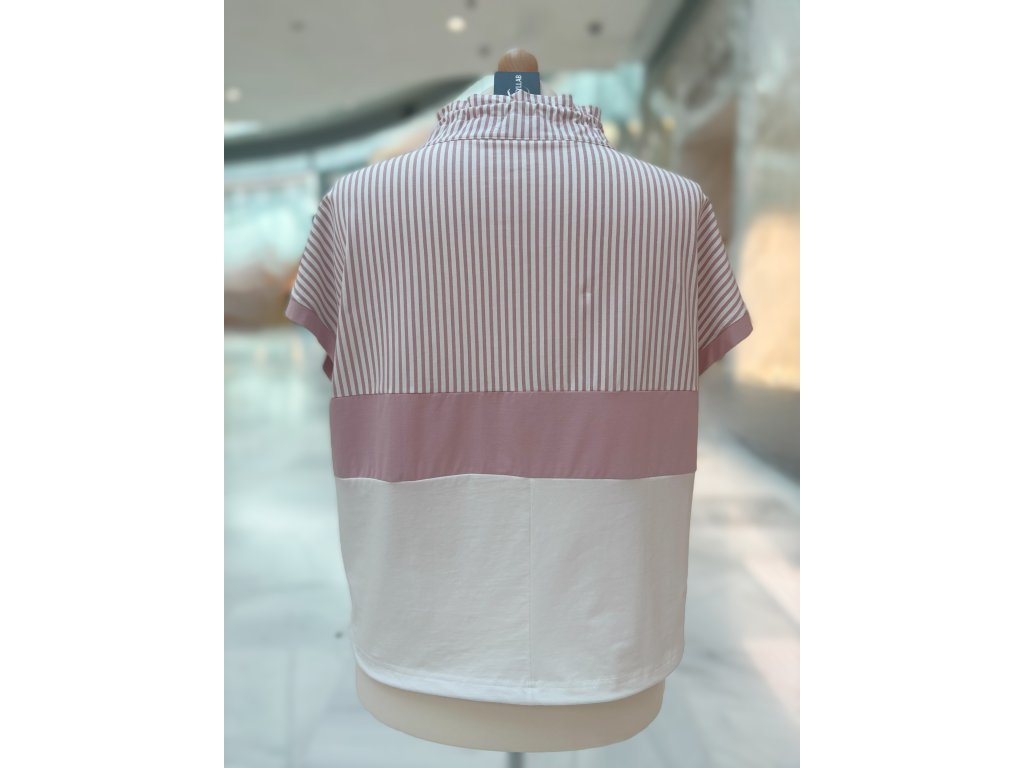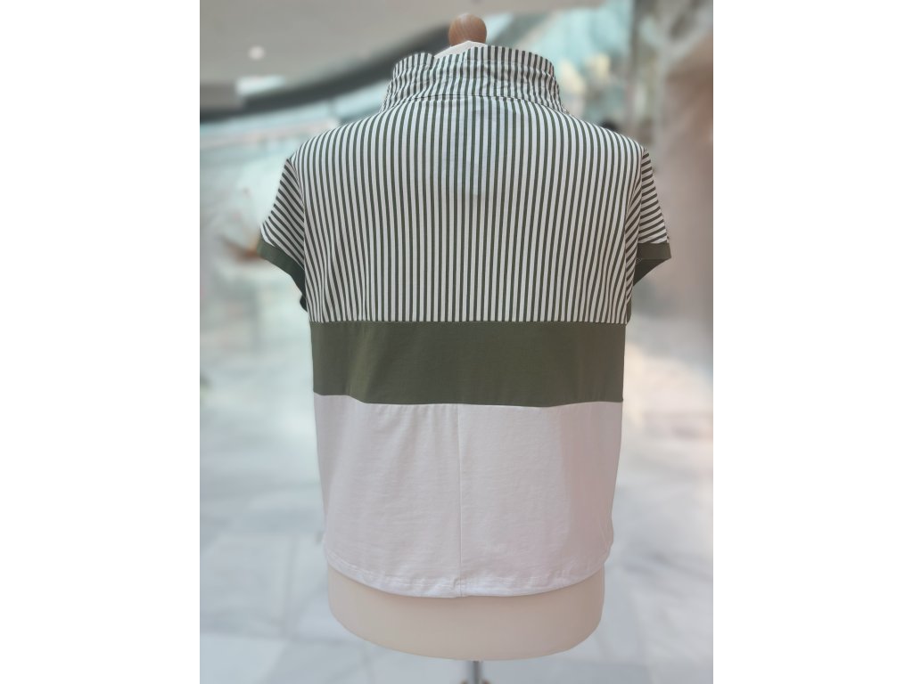 Vlastnosti: – klasický kulatý výstřih s mašličkou – krátký rukáv s kontrastním zakončením – barevné bloky včetně proužků – mírně projmutý střih – měkký a pružný materiál