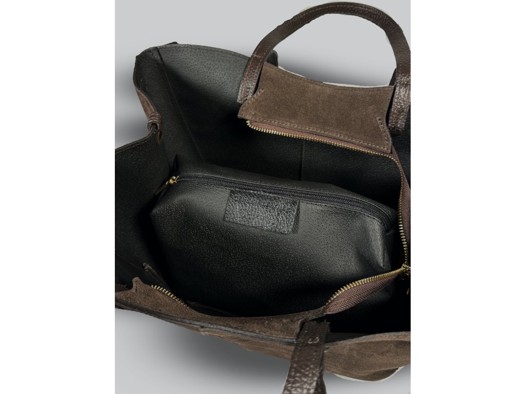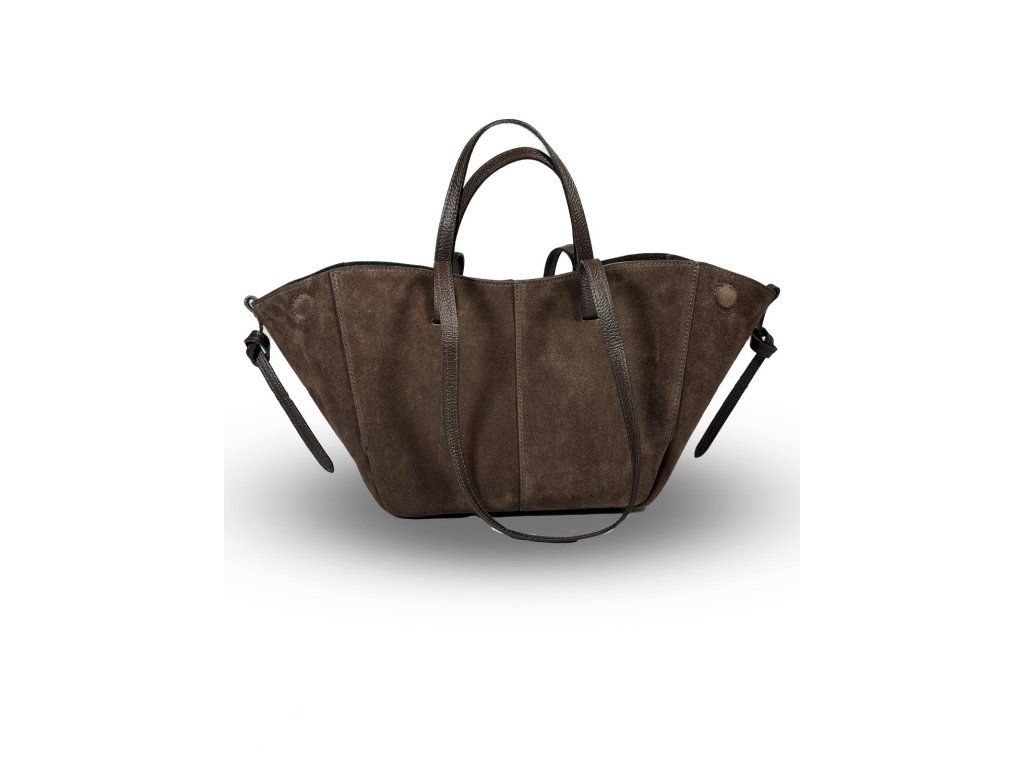 Elegantní semišová kabelka z pravé kůže, vhodná do ruky i přes rameno. Díky magnetickému zapínání na bocích lze nosit ve stylu "lodička" nebo jako klasickou kabelku. Zapínání na zip, uvnitř vkládací taška na zip. Vyrobeno v Itálii. Rozměry 23 x 25 x 14 cm.