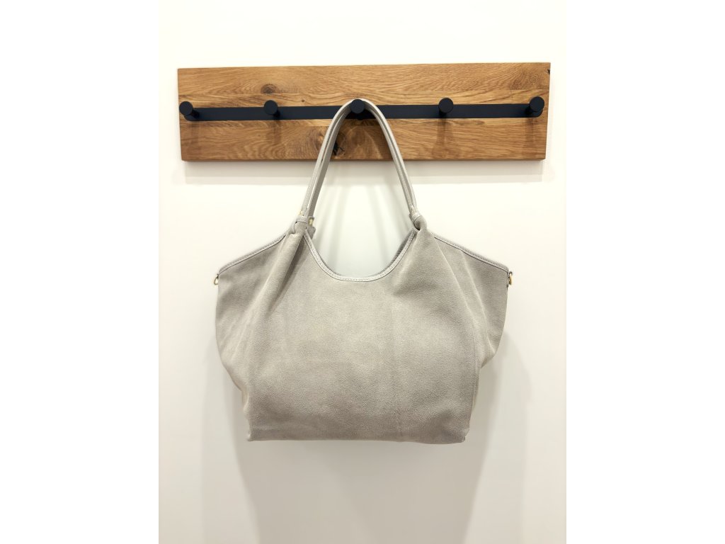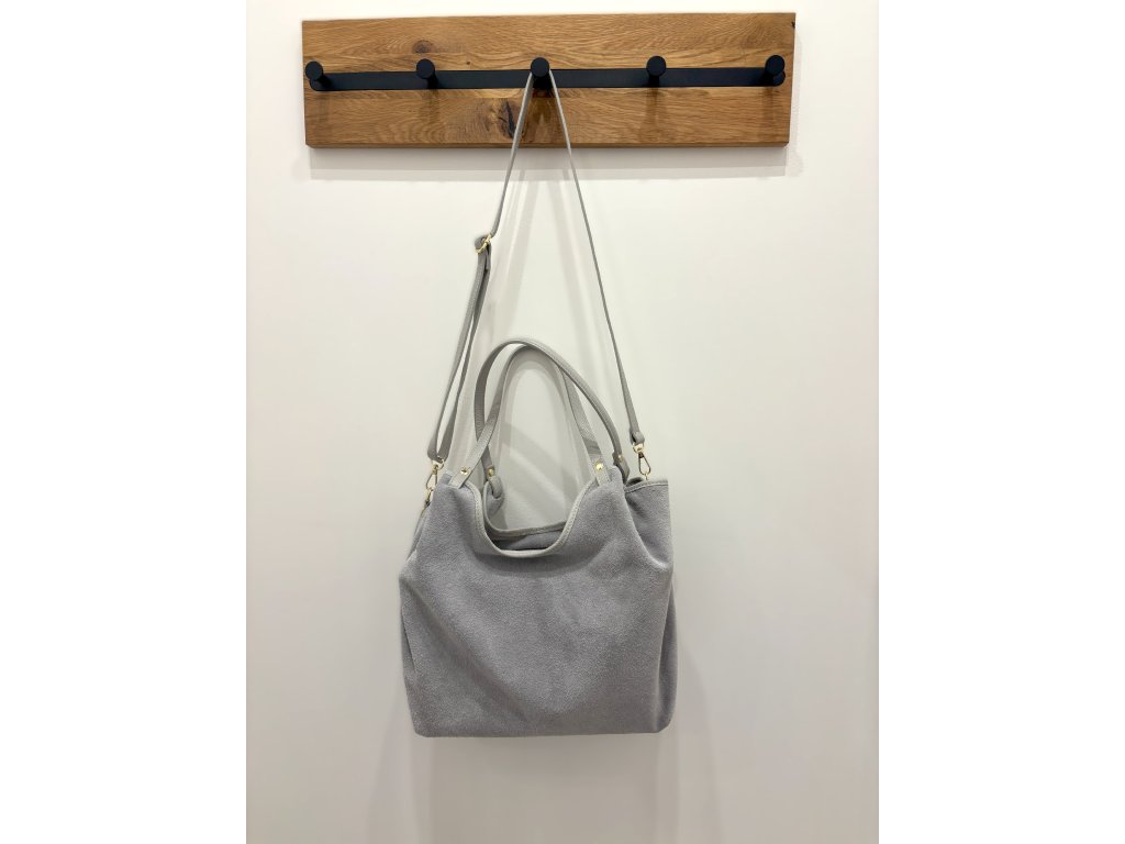 Elegantní semišová kabelka vyrobená v Itálii. Stylová, lehká a prostorná – rozměry: 32 × 26 × 13 cm. Dostupná v šedé a olivově šedé barvě.