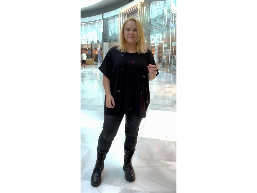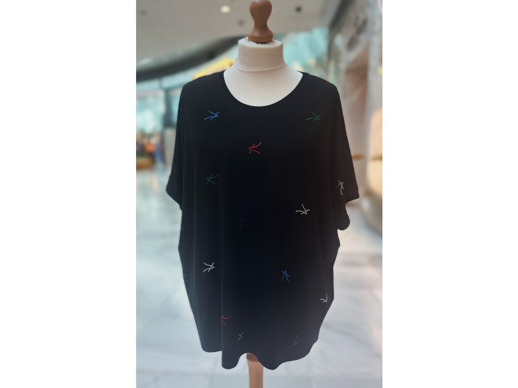 Vlastnosti: – volný oversize střih – výšivky v různých barvách – měkký, splývavý materiál – drobné kamínkové zdobení – příjemný na těle