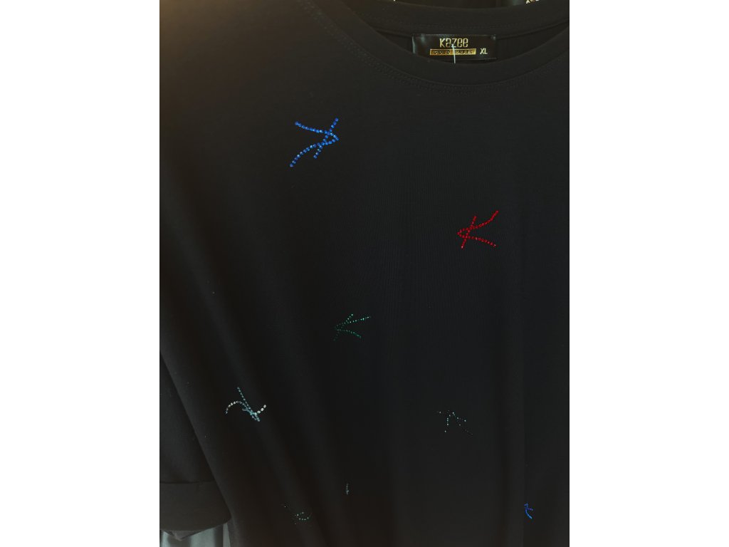 Moderní volné triko s kulatým výstřihem a jemnými kamínky doplněné o decentní výšivky. Velmi pohodlný kousek, ideální pro každodenní nošení.
