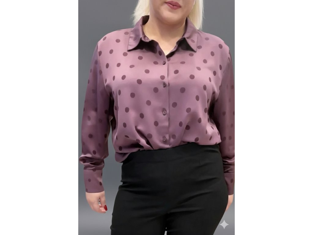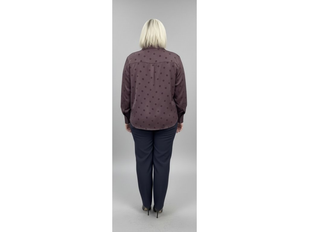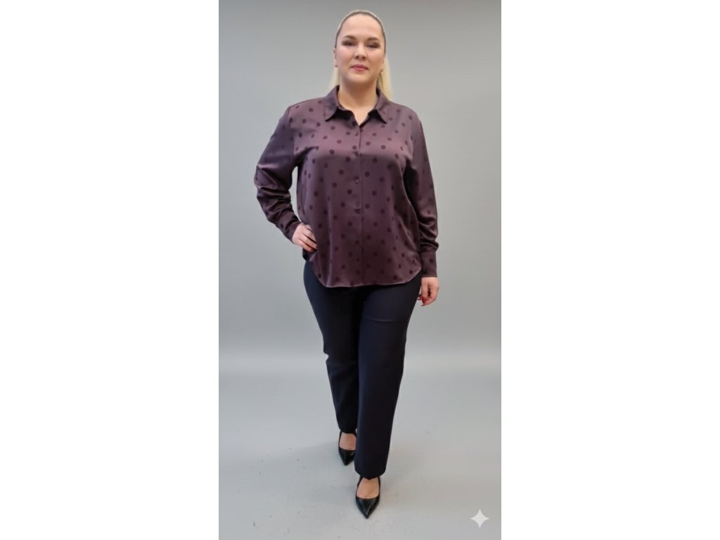 Směs materiálů 57% viskóza, 43% polyester tvoří příjemný pocit na těle, jemný hráškový vzor je trendy dotekem dodávajícím outfitu aktuálnost.