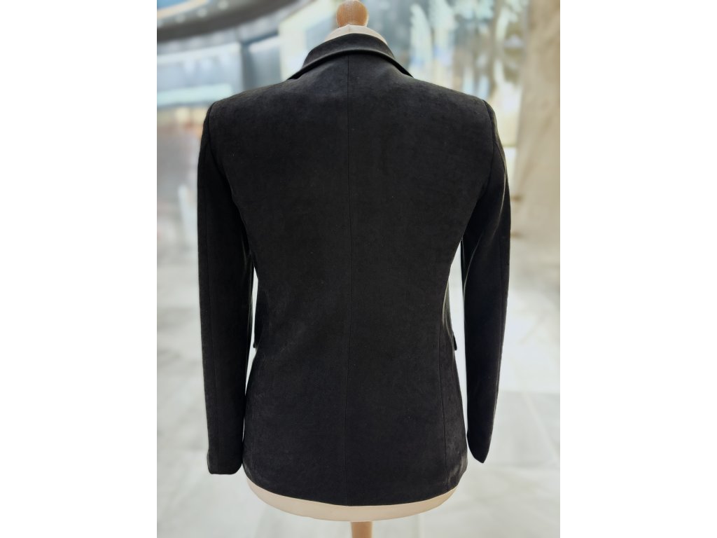 Elegantní černý blejzr v nadčasovém střihu, který vyniká precizním italským zpracováním. Vyroben z kvalitní směsi 98 % polyesteru a 2 % elastanu, díky čemuž je příjemně pružný, pohodlný a dobře drží tvar. Klasický dvouknoflíkový design, reverový límec a dvojice klopových kapes dodávají saku moderní a profesionální vzhled.