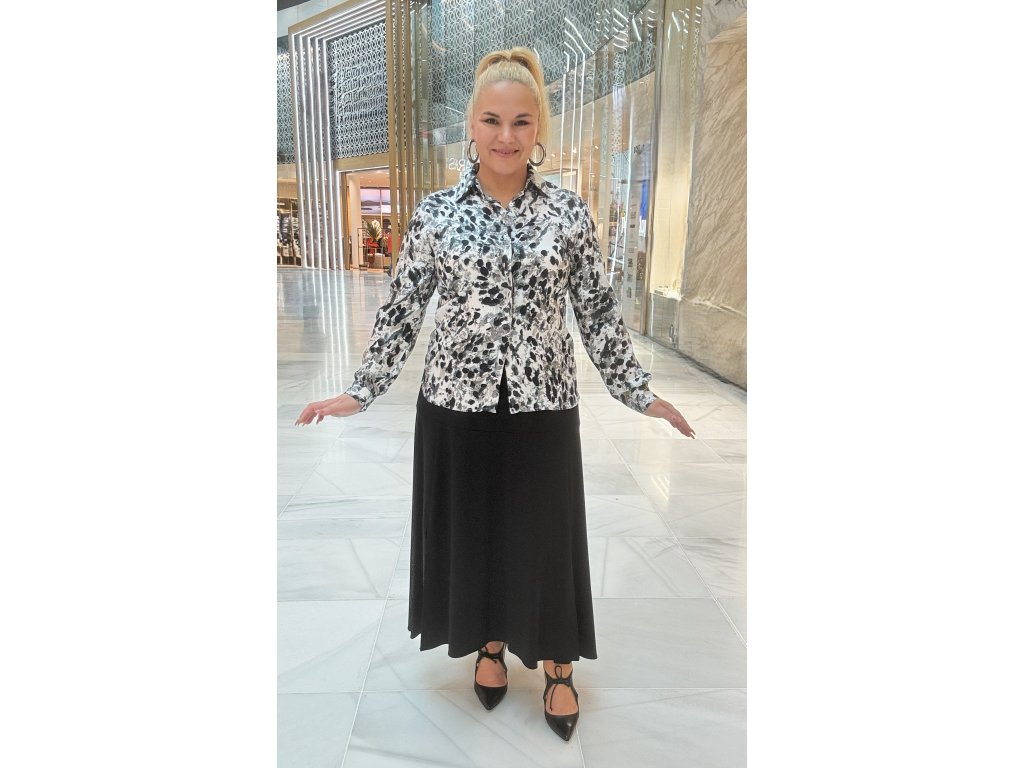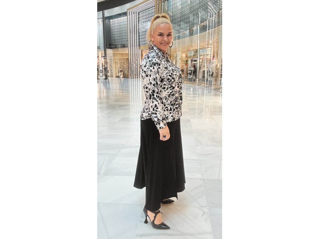 Jemná a elegantní halenka se vzorem, ideální pro každodenní i společenské nošení. Materiál: 95 % viskóza, 5 % elastan – příjemný, prodyšný a lehce pružný. Vyrobeno v Itálii – kvalitní zpracování a stylový design.