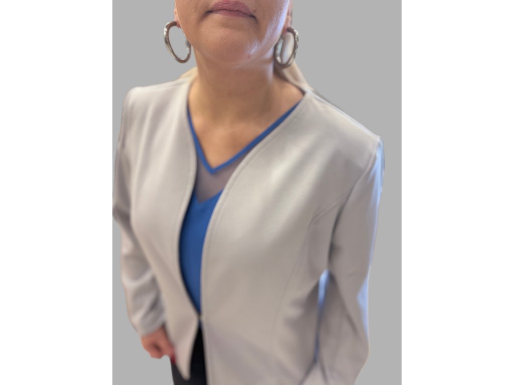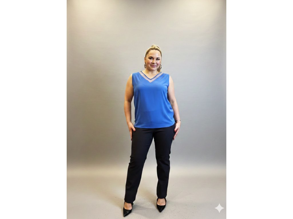 Lehký elegantní top jak k sukním, tak kalhotám pro jarní a letní elegantní vzhled. Top má neobvyklou modrou barvu a zajímavý detail ve výstřihu do V.